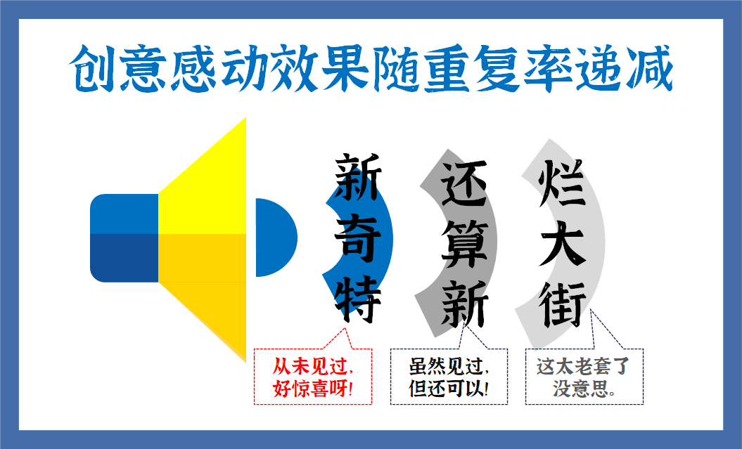 对于未知的/第一性的创意,大众会自发传播;当创意被部分熟知以后,传播仍然有效,但是效率会递减;当创意烂大街之后,大众自然会对此产生脱敏现象,处于完全忽视状态。
