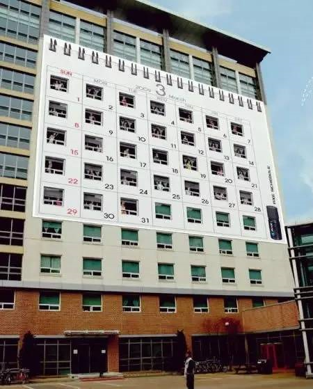 老广告是十几年前 Axe祛除体味的产品广告,一面同样将外墙制作成日历的样子,表现产品每天都能让女人焕然一新,祛除体味。