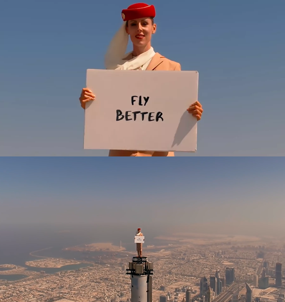 例如,阿联酋航空之前做过一个创意,让空姐站在世界之巅——828米的哈利法塔,举牌子向大众发出广告信息。这个广告创意所制造的震动很强烈,让人都感叹惊险、不要命,从而产生极强的传播力。究其原因,是空姐做了一件极其危险、出格的事,给人留下了强烈的印迹与震撼,所以才产生了自传播的能量。