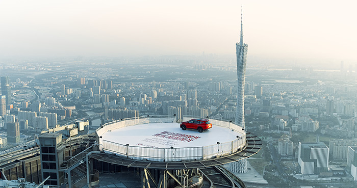 同样的道理,汽车停在马路、开上赛道、趟过泥沙,这些都不够震撼,但是汽车上到400多米的楼顶,便成了一种奇观,这种创意的震撼性更高更强。