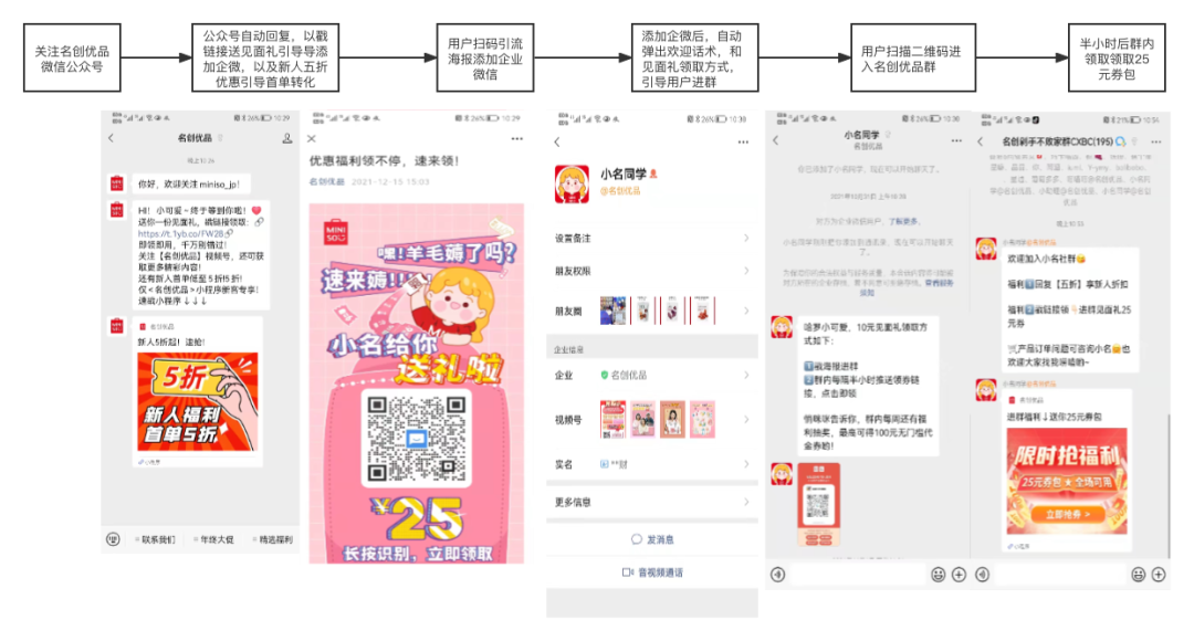 可以看出名创优品在有意塑造一个亲切可爱活泼的私域人设定位,而这个定位也很关键,让企微在后续与用户进行对话的时候,可以按照这个活泼可爱的路线去发信息,去生成活动海报,引流海报里的“嘿!羊毛薅了吗”……,还有第一次回复的“哈啰,小可爱”等等,都维持了私域ip人设定位的一致性。