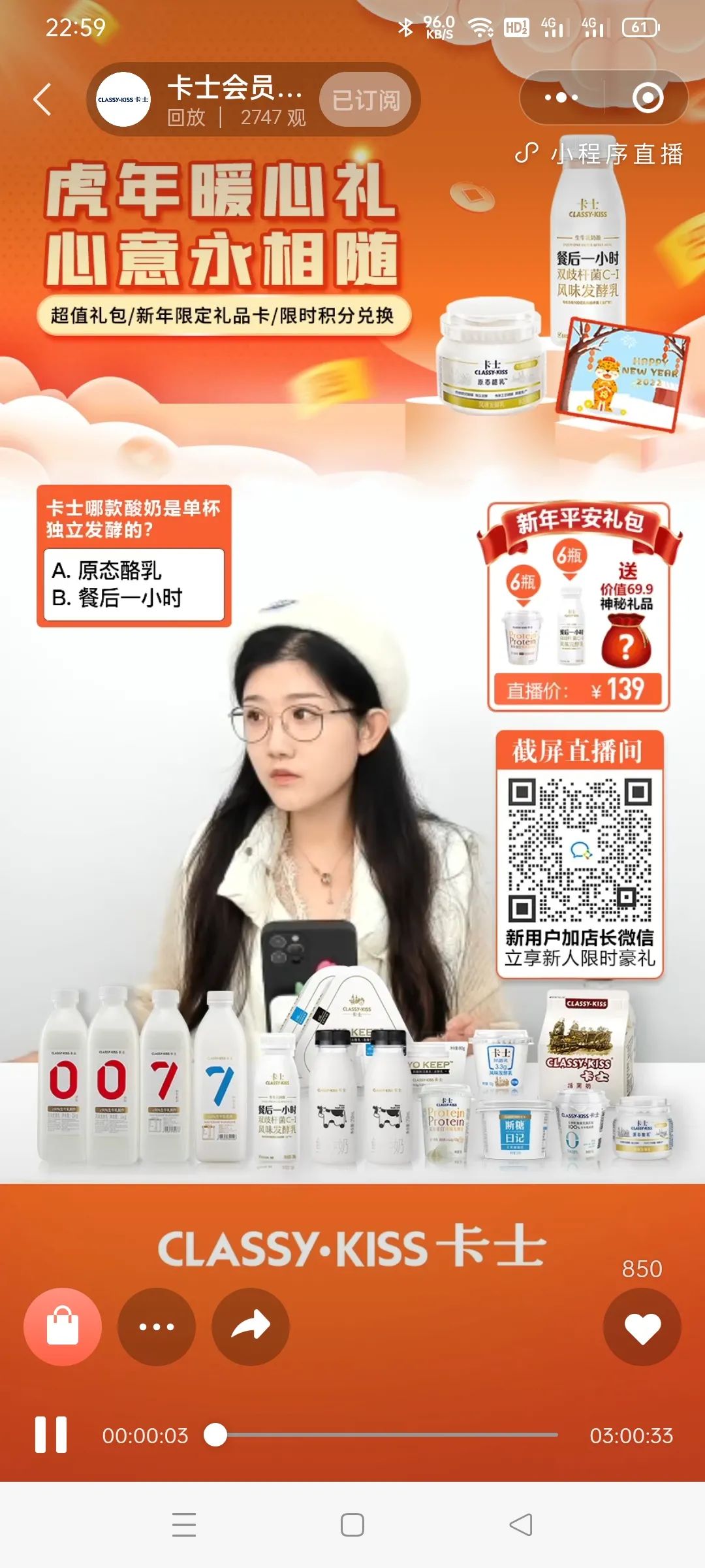 卡士经常做直播,然后通过直播间的icon引导,用户点击之后直接跳转到直播回放,直播回复不仅可以让用户看到直播的活动,还可以持续的通过直播贴片进行私域导流,一举两得。