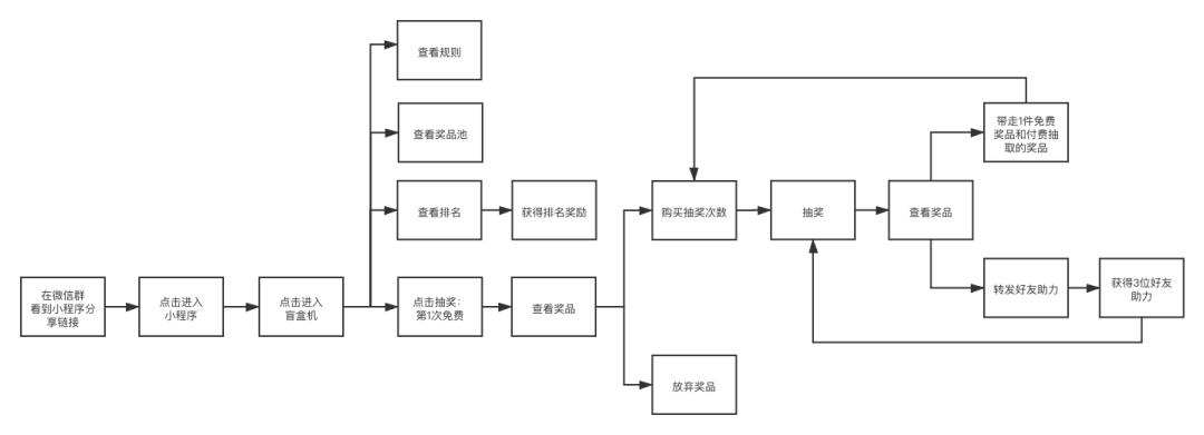 这次的拆盲盒活动,还是挺简单粗暴的,直接开局就送1个拆盲盒的机会,100%中奖,免费拆的盲盒奖品需要和至少1个付费盲盒拆出来的奖品一起带走,付费拆之后,可以转发邀请好友助力,3位好友成功助力即可再获得1个免费拆盲盒的机会。