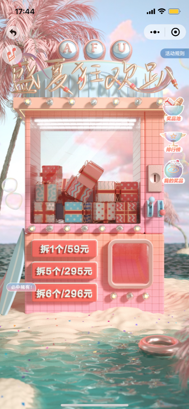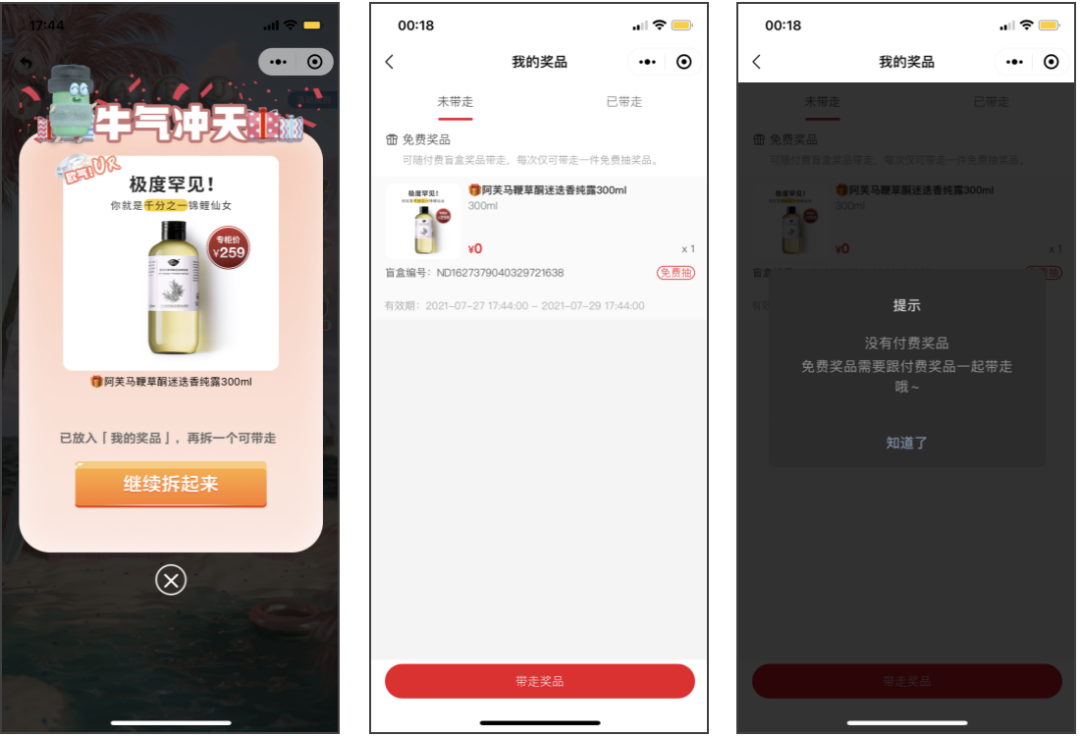 1)选择了近两年很火热的盲盒作为活动主题,贴合时下年轻人追的热点,并且在用“免费拆和100%中奖”作为诱因,用户在不仔细阅读规则的时候,顺手就去拆盲盒了,查看奖品后,才知道需要和付费拆的奖品一起带走;