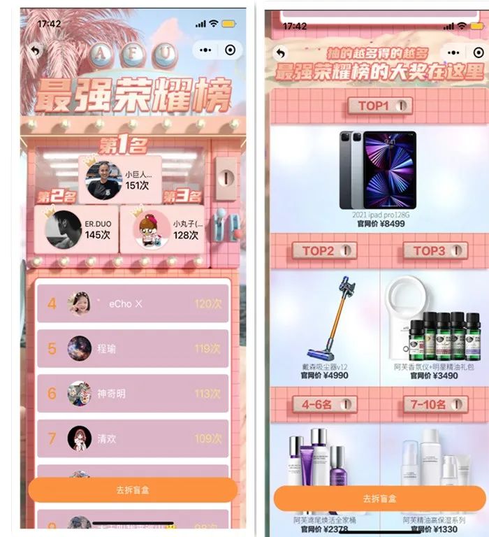 同时还有开盒排行榜,根据开启盲盒次数排序,榜单前10可以获得额外奖品。