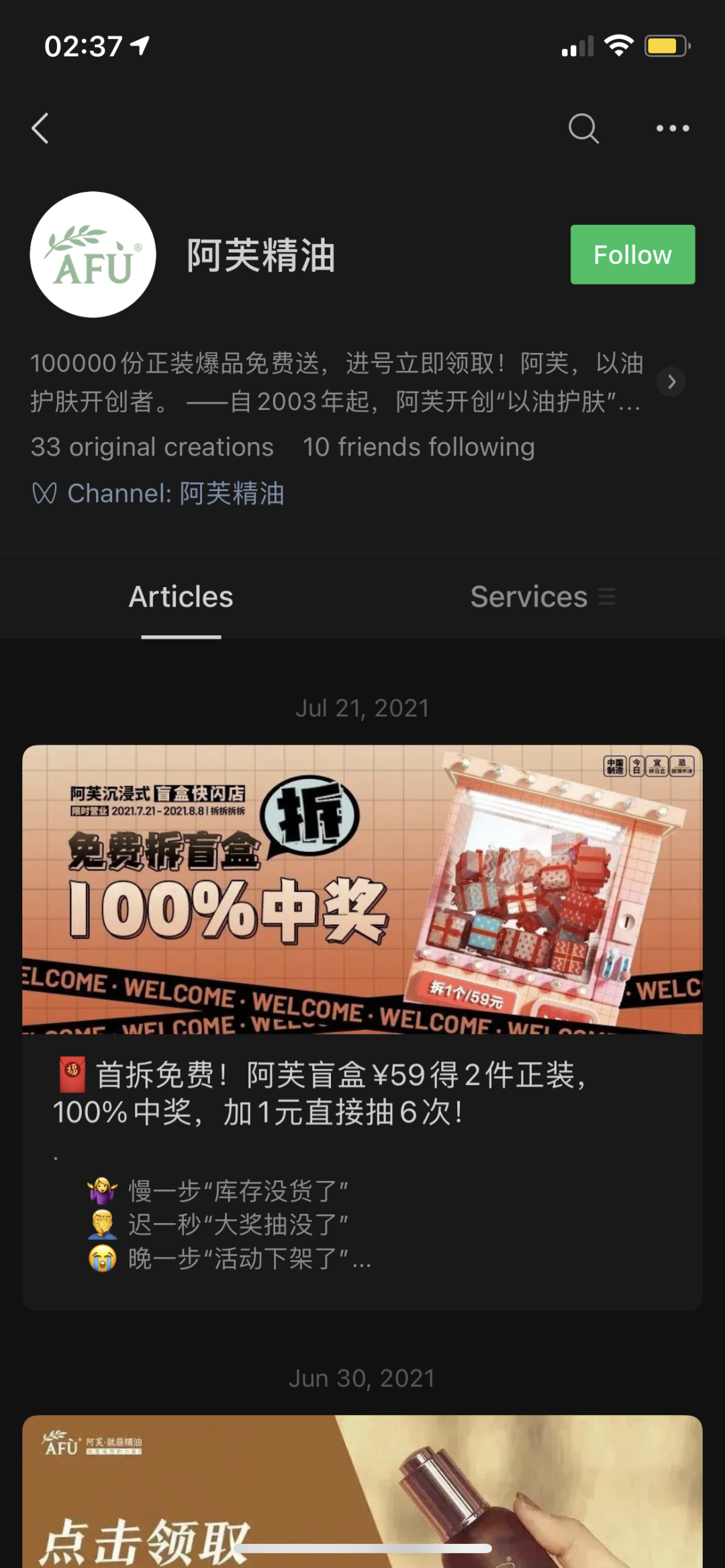 活动发布渠道在微信公众号内,以推文的形式引导进来小程序,而关注阿芙公众号的,大部分是已经购买过产品、有意向、或者免费领小样活动来的,目标用户群体选择很明确。