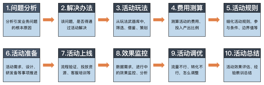 10、活动总结:复盘总结本次活动的整体效果、活动增益、活动不足、沉淀营销策划经验。
