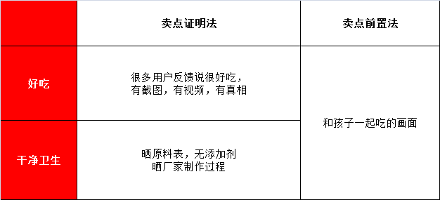 罗列零食的功能卖点:好吃,干净卫生(ps:这里只拿这两个主要的功能卖点举例)