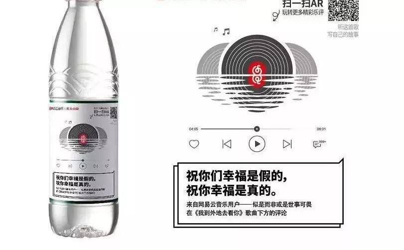 于是,网易云音乐就和农夫山泉合作了,这时候,农夫山泉的产品就变成了一个媒体,消费者每喝完一瓶农夫山泉至少需要一分钟,也就意味着在这一分钟之内,农夫山泉瓶身上的网易云音乐至少会占据消费者的注意力,而无数瓶农夫山泉就构成了一个颇具规模的媒体群。
