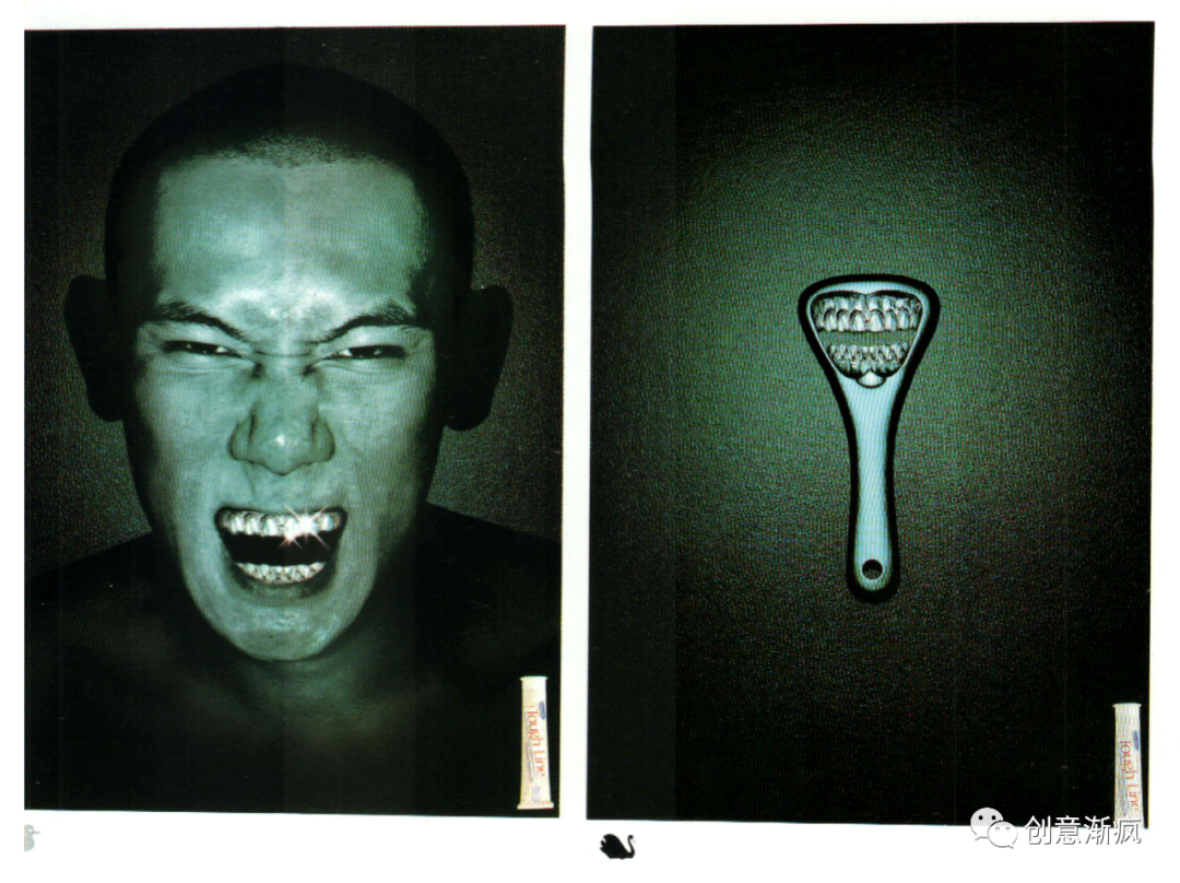 在《丑小鸭:奥美的创意观点》(中信出版社,2009)这本书中,收录了大量精彩的案例,但它跟其他同类的广告著作又有很大区别,或者说这本书最大的价值,就在于:它将创意作品的“初级状态”和“高级状态”,分别呈现了出来,让我们对两种创意水准的对比一目了然。这里,我在该书推荐的作品中选取了几则,从我的角度,再为大家来深入解读一下。每一组案例中,左边,是创意的雏形,也就是长相平平的“丑小鸭”;而右边,就是经过优化,可以称之为“白天鹅”的创意。案例:固齿牙膏