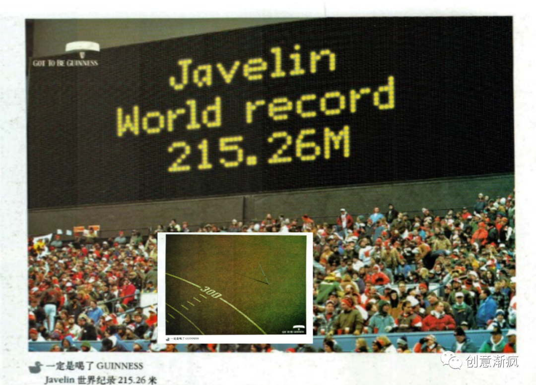 这一组是健力士黑啤的广告,第一张图,从赛场的大屏幕上,我们可以看到某一位选手创造了标枪的世界记录,因为他喝了GUINNESS。但是这个创意手法太符合逻辑,不会让人感到太意外。