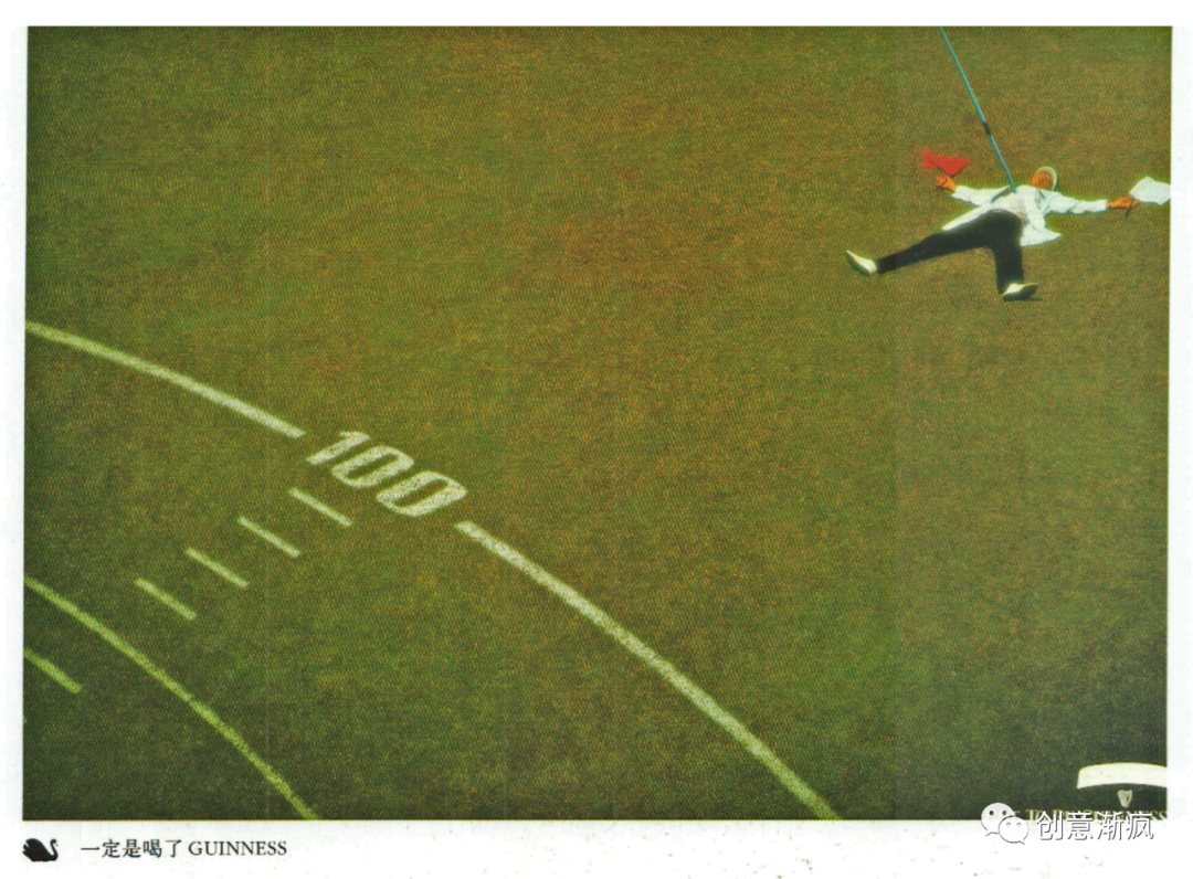 下面这张图的效果就不一样了:仍然是在赛场上,可裁判居然被标枪射中倒在了地上,这是怎么回事呢?根据图中分析,裁判离标枪的最佳成绩区还很远,本来不可能被射到,如果真的中招了,那一定是选手喝了啤酒超常发挥,才导致这不可思议的一幕。显然,第二个创意更具有冲击力,毕竟人命关天。这也体现了GUINNESS黑啤不循常理的品牌个性。
