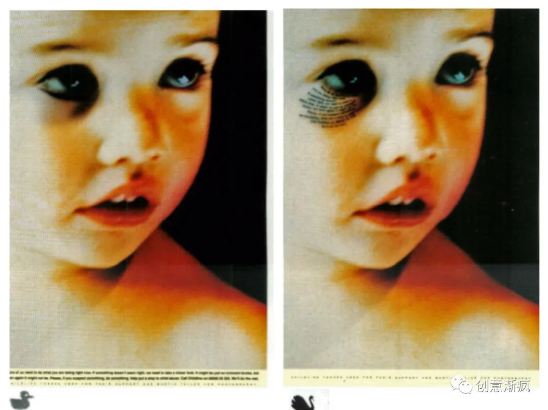 这是两张呼吁停止家庭暴力、保护儿童的公益广告。两者间的区别,仅仅是文案位置的不同。左边这一张,文案在画面最下方,很容易被人忽视。而右边这一张,直接将文案挪到在孩子眼睛下方,构成了“乌青”的形状。这个小小的改动,却有一举两得的大效果,既能让大家注意到孩子被虐待的惨状,又能让人有兴趣去细品里面的文案,称得上是“天鹅级”的创意。