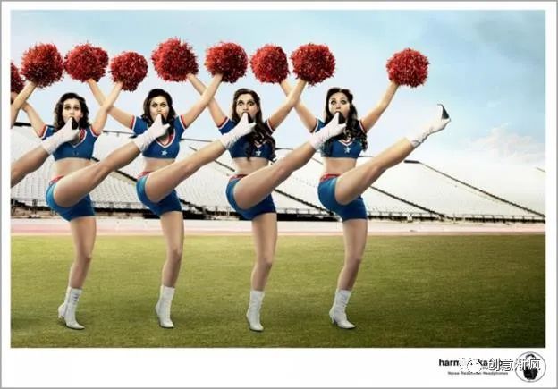 而下边这张,就有创意多了:啦啦队的热辣舞蹈居然卡壳了,这一切只因你戴上了哈曼卡顿的耳机。