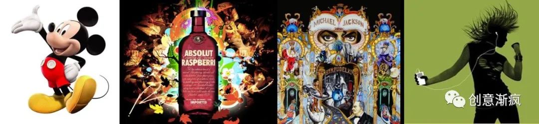 第二组是商业创意,里面有米老鼠、绝对伏特加的酒瓶、Michael Jackson(迈克杰克逊)的唱片封面,还有苹果iPod标志性的剪影。