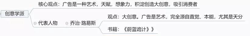 第三个学派是创意学派,好的创意能够促进销售是一定的,但问题在于好创意是不稳定的且难以衡量的,就像此学派最伟大的广告人之一——乔治·路易斯说的,广告是艺术,他完全源自直觉、本能,尤其是天分。按照这个理论,能够真正做出好创意的人并不多,水准稳定的就更少了。我个人认为此学派在营销一体化的层面上发挥有限,因此在这里就不多做解读了。建议大家好好读一读《蔚蓝诡计》。