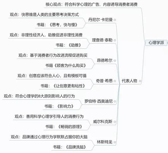 第四个学派是心理学派,从这个学派开始,理念将区别于传统的营销理念,让营销达到效果更加可见的一体化。心理学派的代表人物并不一定是广告营销从业者,更可能是科学心理学家和行为学家,他们的研究对于人类的普遍心理和行为都有较为科学的分析和判断,而这些分析和判断对于营销者制定什么的营销策略和内容都有很大的启发。