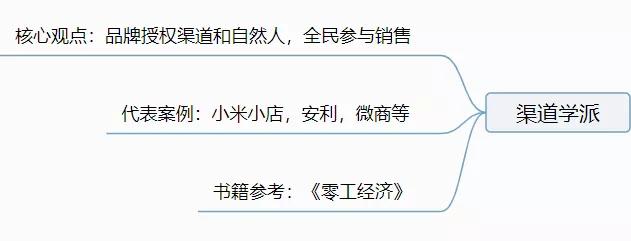 第六个也是最后一个学派,是我个人认为比较重要的,我称其为个商学派,或渠道学派。渠道是营销四大要素4P之一,传统渠道是品牌自己拓展的店。而移动互联网和共享经济的发展带来了一个新的阶层,个商主义者,他们的特点是以个人小夫妻店甚至单人为主体,大多通过兼职的方式为品牌进行传播和销售,获得收入。对于品牌来说,它们将品牌授权给这些个商主义者,让他们去传播,去售卖,扩大了自己的渠道和销售。