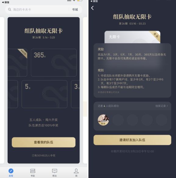 无限卡战队活动的规则是,用户分享活动到微信,拉微信好友组成五人的战队,然后每周六会开奖,奖品可能是1天/3天/5天/7天/30天/365天/终身无限的阅读卡。无限卡会员可在限定时间范围内免费阅读全场书籍。