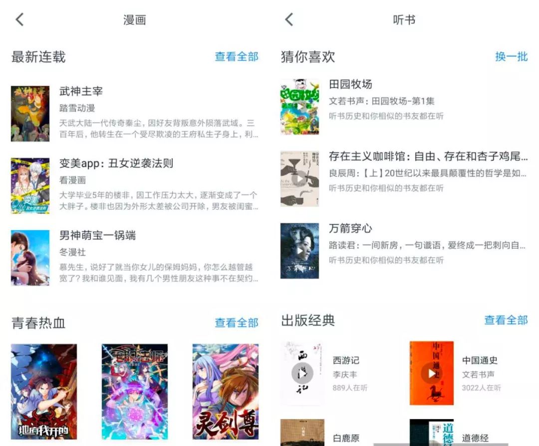 内容上,不断丰富和拓展图书品类,从最初主打严肃阅读的出版读物,扩展到后期的有声化读物和漫画类内容。