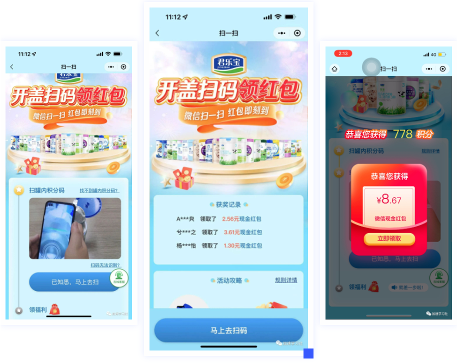 仔细研究后,我们发现君乐宝长期以来做了大量数字化基础设施投入,以君乐宝扫内码活动为例进行介绍。(内码,顾名思义就是印在奶粉罐子内的二维码,印在奶粉罐铝膜内面,需要撕开奶粉罐铝膜纸才能看到)