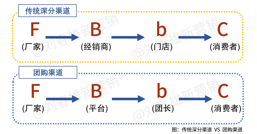 传统深分渠道环节是:厂家→经销商→门店→消费者,简写为F2B2b2C;团购渠道的环节是:厂家→平台→团长→消费者。仍然可以简单表达为F2B2b2C。从渠道长度看是一样的。