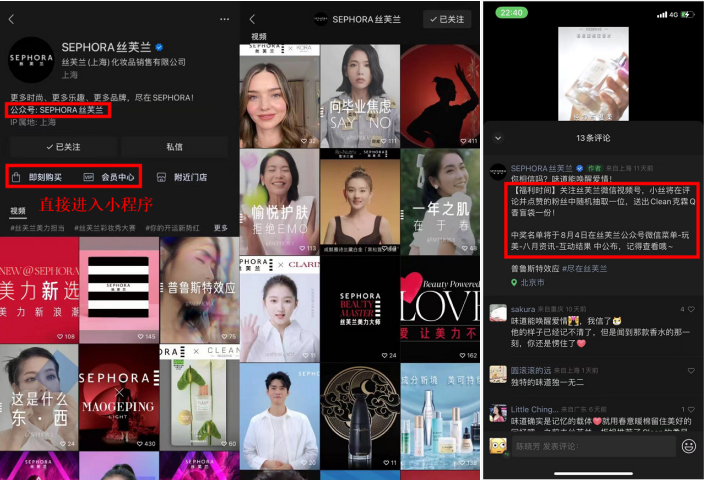 丝芙兰公众号主页面绑定丝芙兰视频号,丝芙兰视频号主要作为品牌活动的宣传阵地以及同消费者互动对接的窗口,与公众号互通。