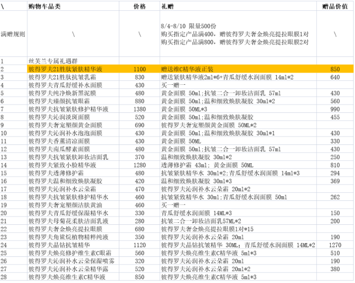 买赠限量:8/4-8/10活动期间 限量500份:购买指定产品满400,赠彼得罗夫奢金焕亮提拉眼膜1对;购买指定产品满800,赠彼得罗夫奢金焕亮提拉眼膜2对。