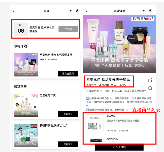 丝芙兰不用视频号发起直播,而是在视频号内嵌小程序,在小程序中进入美力直播,美力直播主页以时间轴的形式展示直播内容,置顶最新一期的直播订阅,可以往下查看过往直播;下一场直播一般提前一天预告,点击预约或查看直播主题详情。