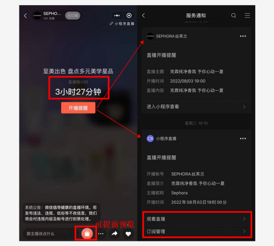 直播前的推广做的不是特别完善,虽然在各个模块设置了直播提醒,但是缺乏主动推广,企业微信也不会转发直播推文或者通知,公众号也没有即时的直播预告,除了熟悉丝芙兰的用户会主动进入小程序进行关注订阅直播外,很难引起其他用户的兴趣。