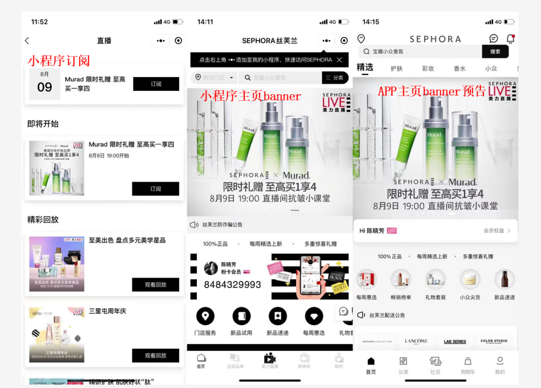丝芙兰将直播日常化,私域联动可以做的更加完善,比如可以用不同形式去进行直播信息的同步展示,将微信生态形成一个整体,展现一个统一的品牌形象,保持内容的一致性又由于形式的多样化不会让用户感到无趣。