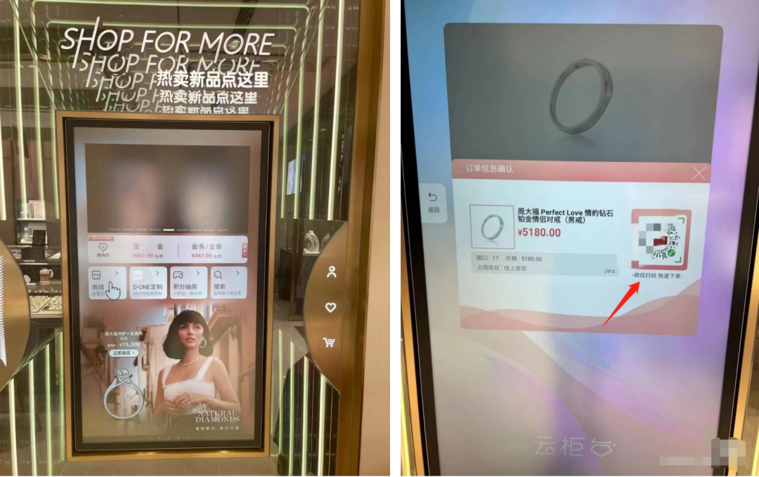 周大福在线下设置云柜台,用户可自助选择款式,扫码引流到小程序下单。