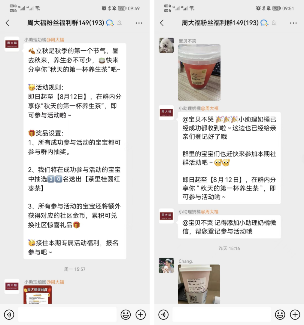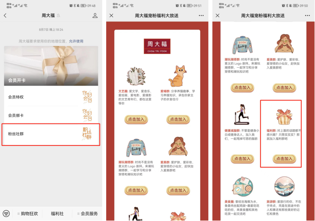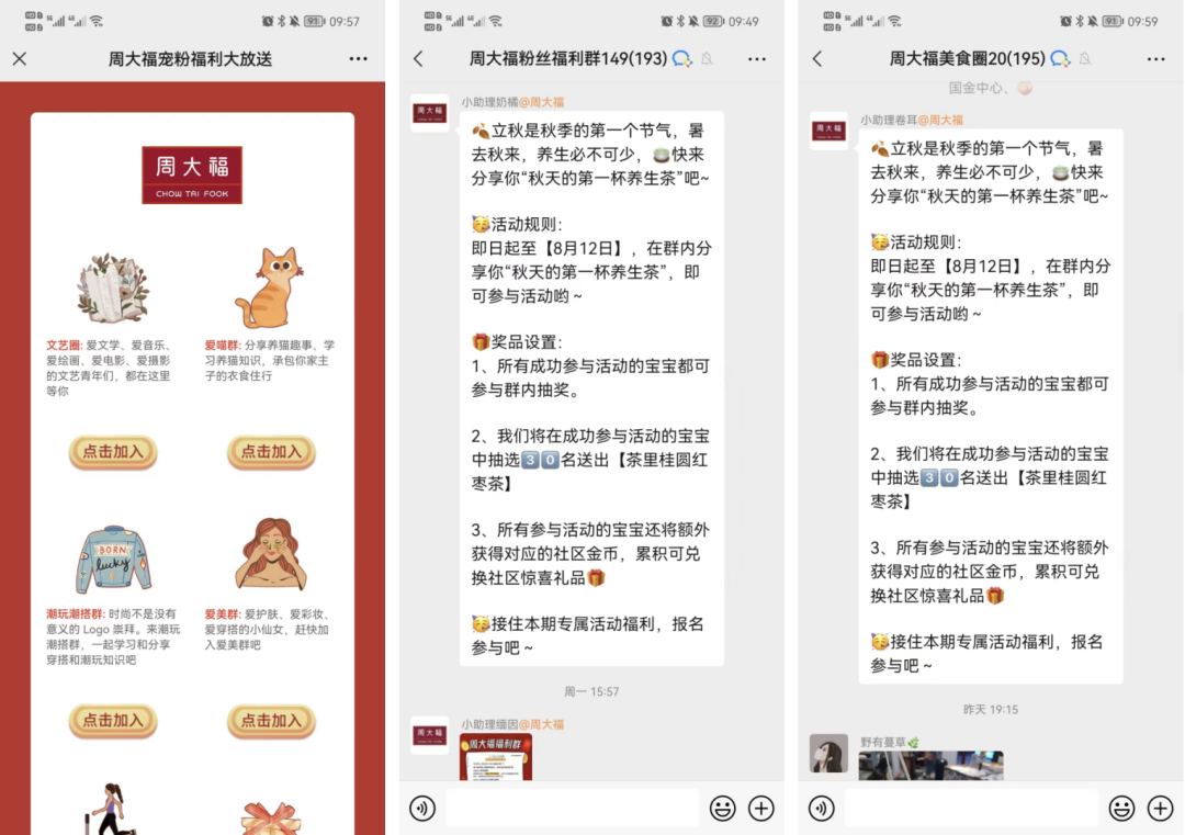 4、社群分层周大福运营了不同属性的社群,包括美食群、福利群、爱喵群、文艺群等。用户可以根据不同需求加入社群,不过社群内运营动作基本一致。