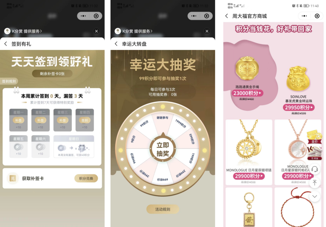 3、积分体系周大福的积分体系分为:周大福积分和K分赏积分。周大福积分:通过消费或完成任务获得积分,积分可换购商品或参与会员活动。