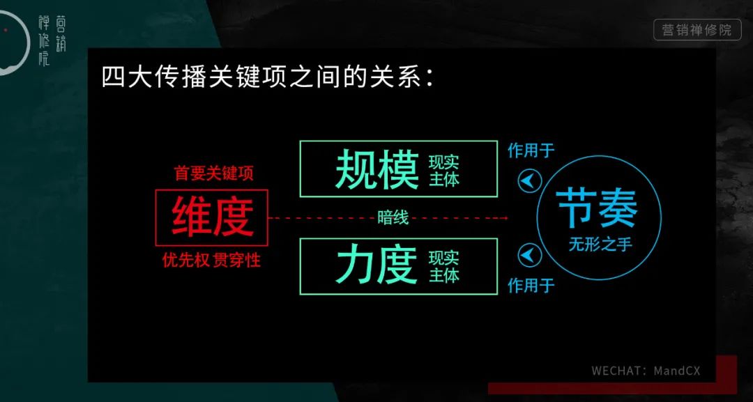 那在实际操作中,传播策略到底怎么搞?都有哪些组合策略?小僧以为,传播组合策略可以有千千万,但关键项不外乎维度、规模、力度、和节奏这4个。