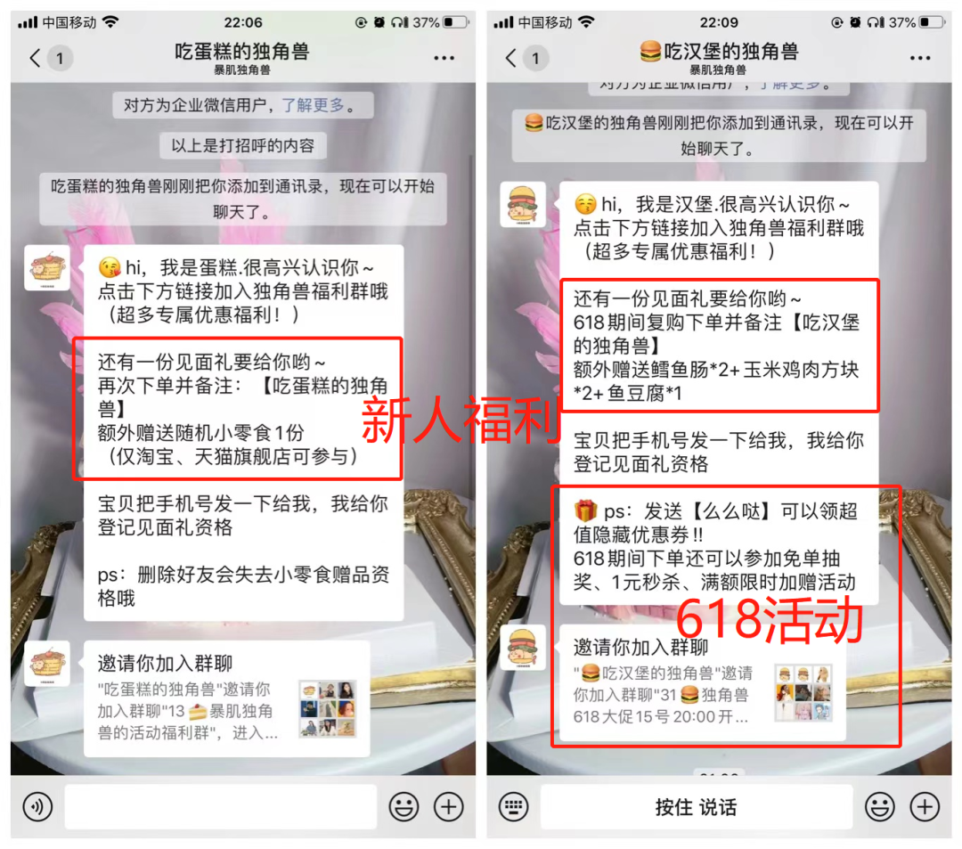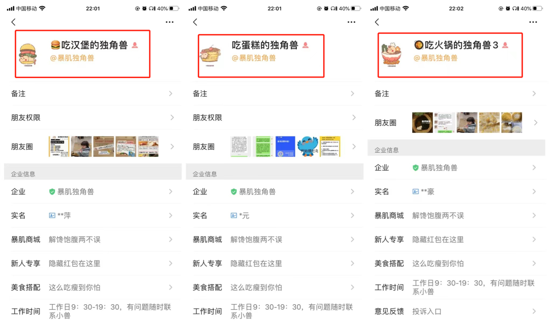 从公众号【暴肌独角兽】引流添加的是【吃蛋糕的独角兽】、从服务号【暴肌独角兽服务号】引流二维码添加的是【吃汉堡的独角兽】,可能这两个渠道的人群特点有细微差别,说明品牌也是有区分用户来源的。