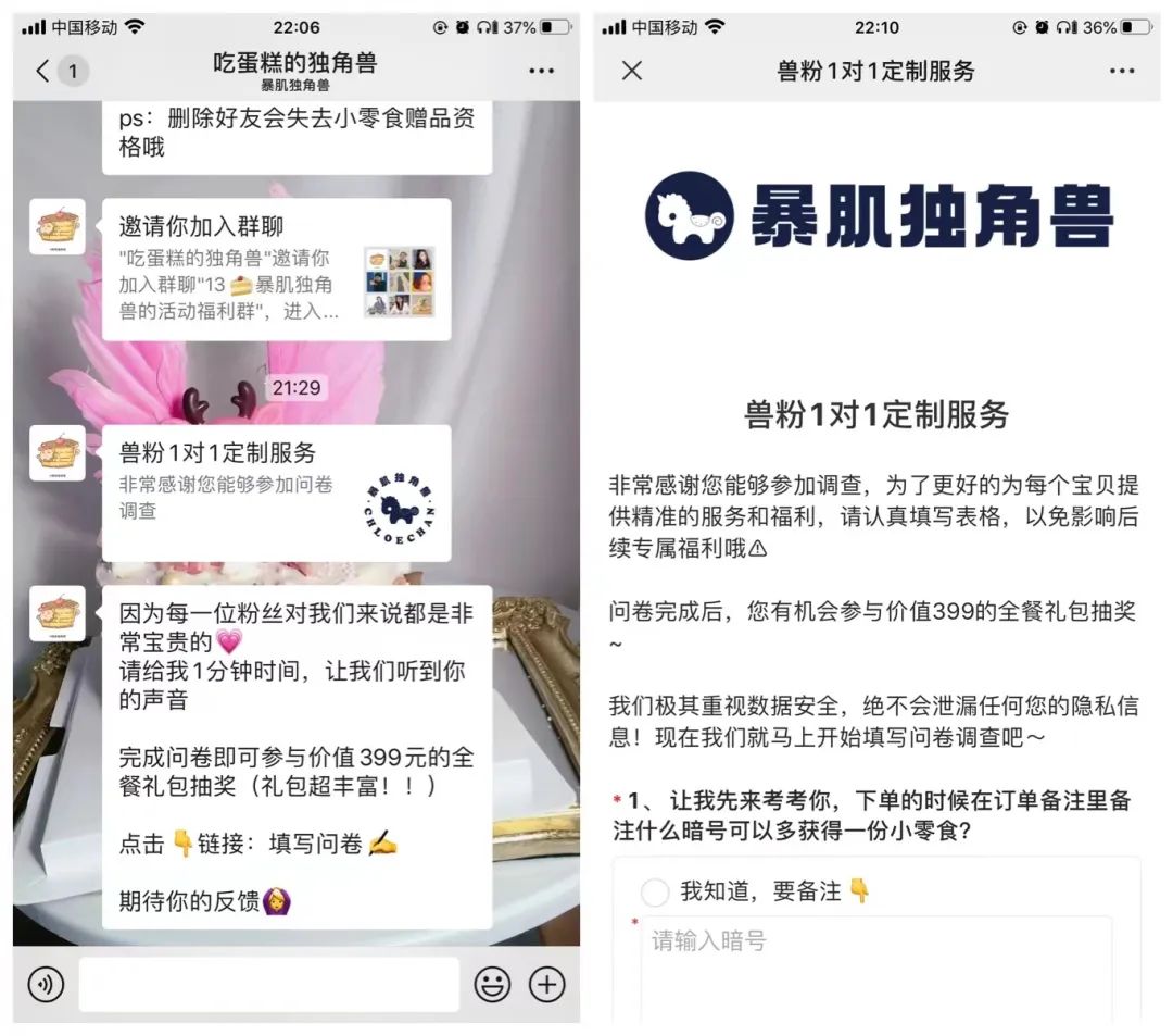 自动通过好友30分钟后,会自动进行回访,让用户填写1v1问卷,猜测后台会根据这些问题的答案给用户打上标签,形成简单的用户画像,方便后续个性化推送商品;