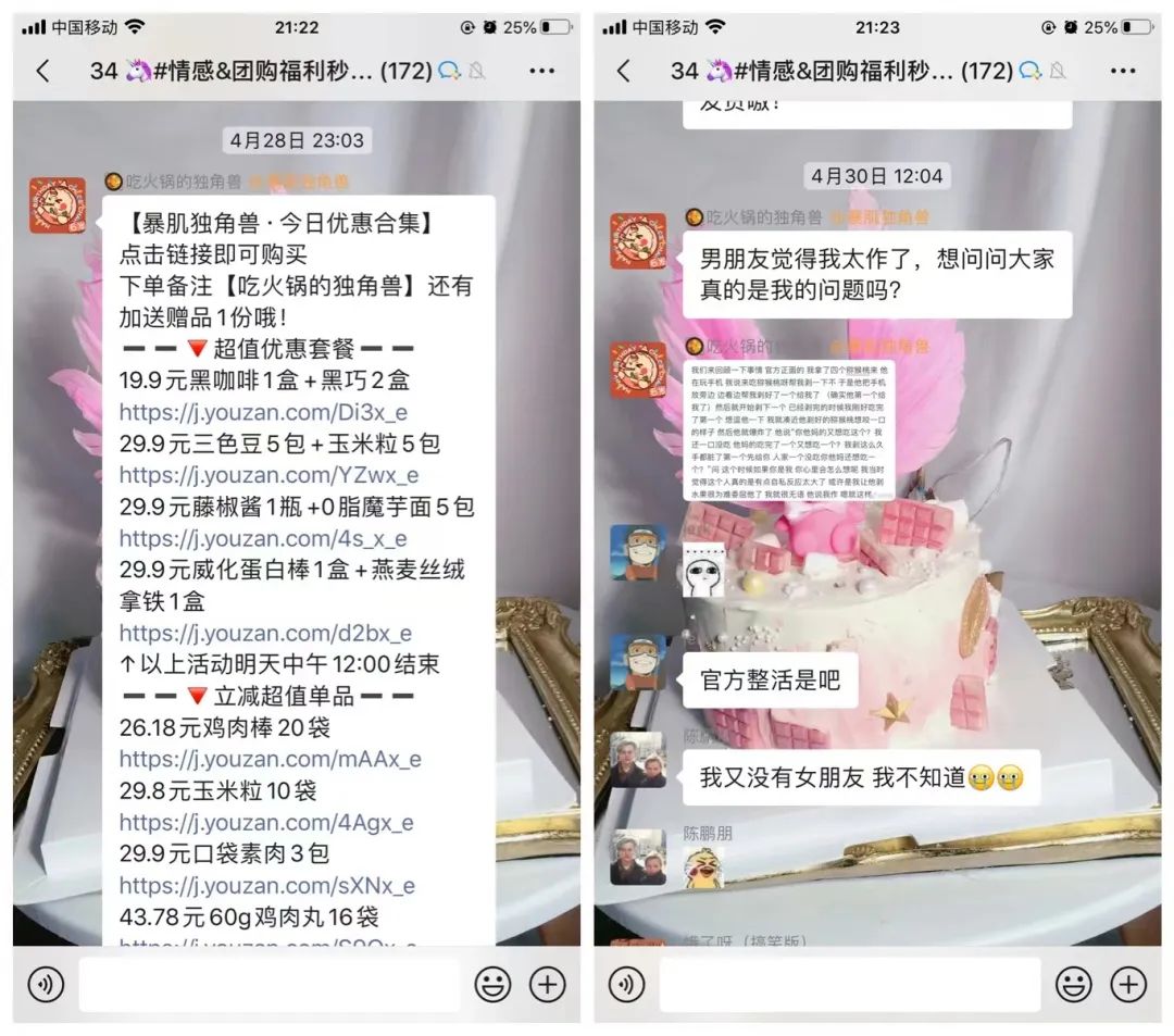 福利群主要以发放福利为主,采用紧迫的限时优惠时间+优惠价格+抢单氛围相结合,不断刺激客户付费转化。交流群主要以交流为主,情感群主要以情感交流为主,上班群主要是职场白领互相讨论的地方,同时会植入部分产品种草,引导用户下单。