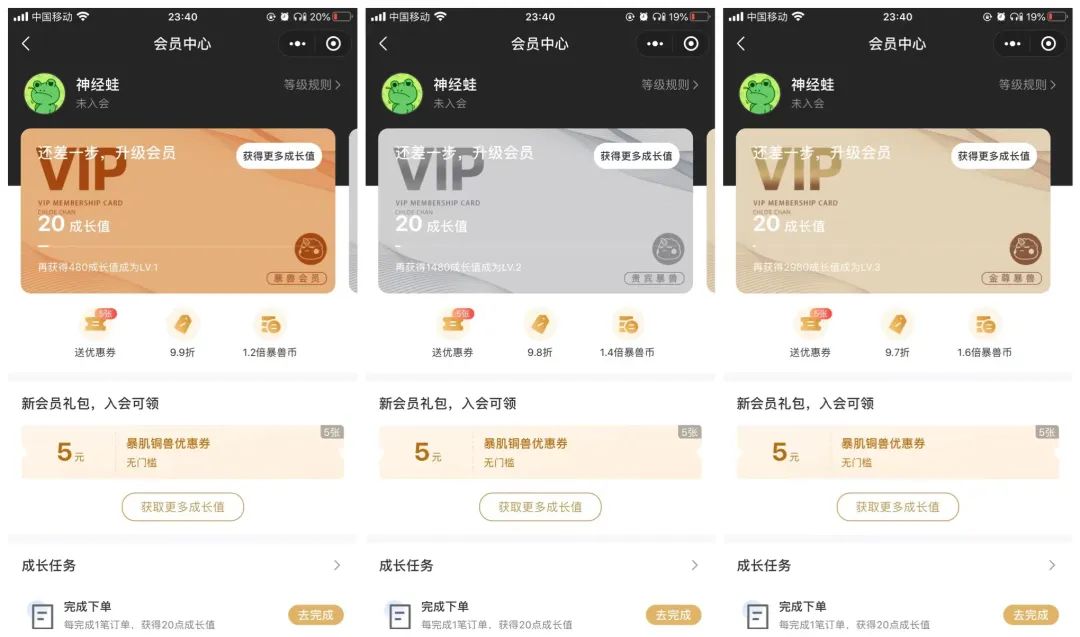 会员等级:暴兽会员(满500成长值)——贵宾暴兽(满1500成长值)——金尊暴兽(满3000成长值)