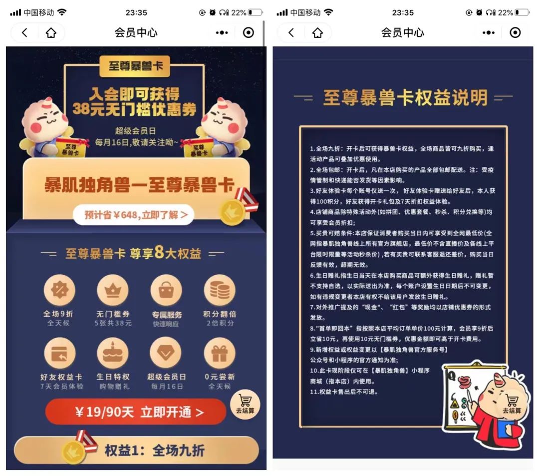 会员权益:成为至尊暴兽卡,可以享受八大权益,全场九折、无门槛优惠券共38元、客服专属服务、积分翻倍、好友权益卡、生日特权、超级会员日(每个月16日)、0元尝新。