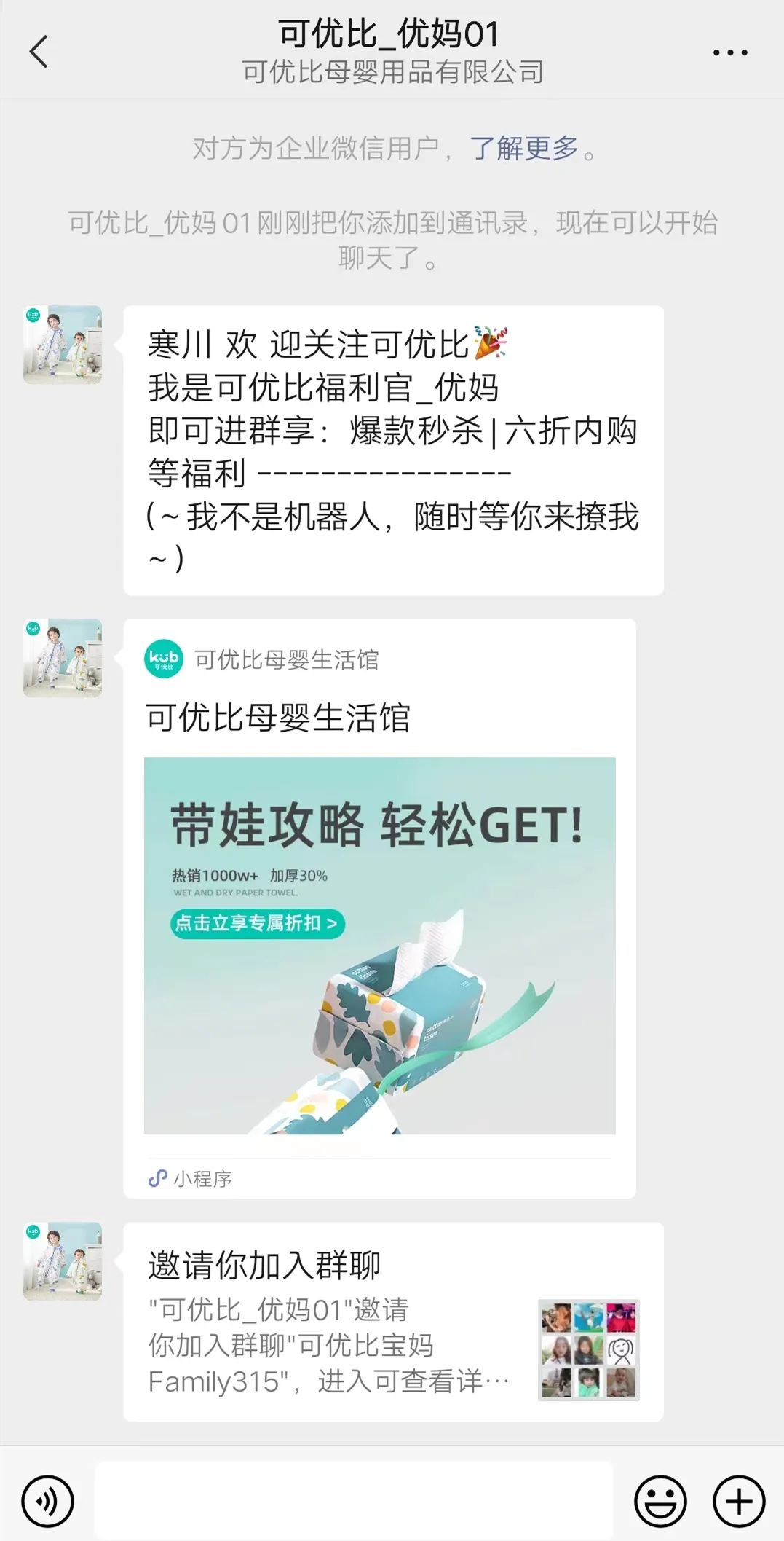 添加企业微信后,优妈会自动回复一条欢迎语、一条可优比小程序,以及回复一条入群邀请。
