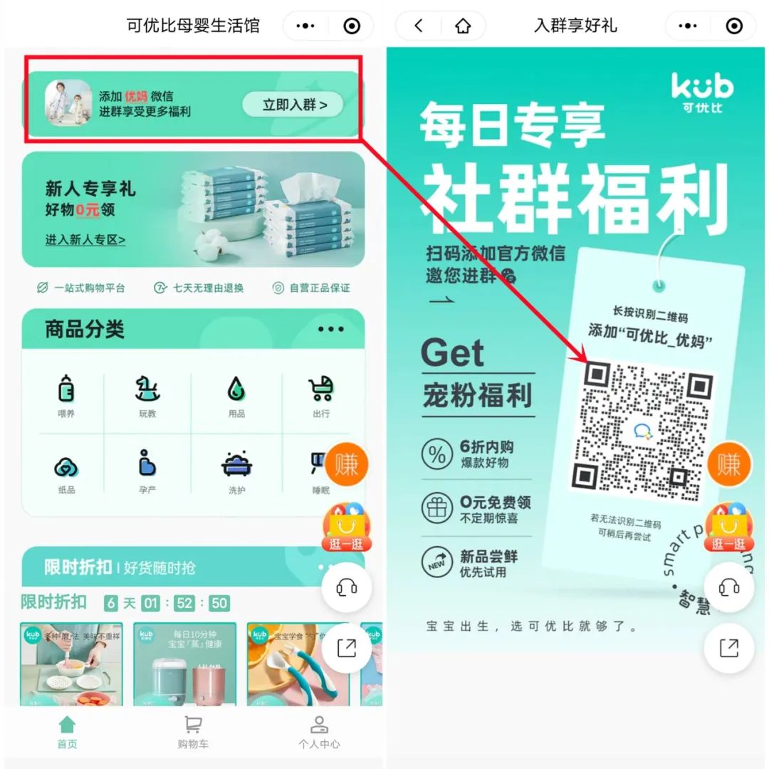 路径是小程序可优比母婴生活馆——首页立即入群——承接页——扫码添加优妈企微——入群
