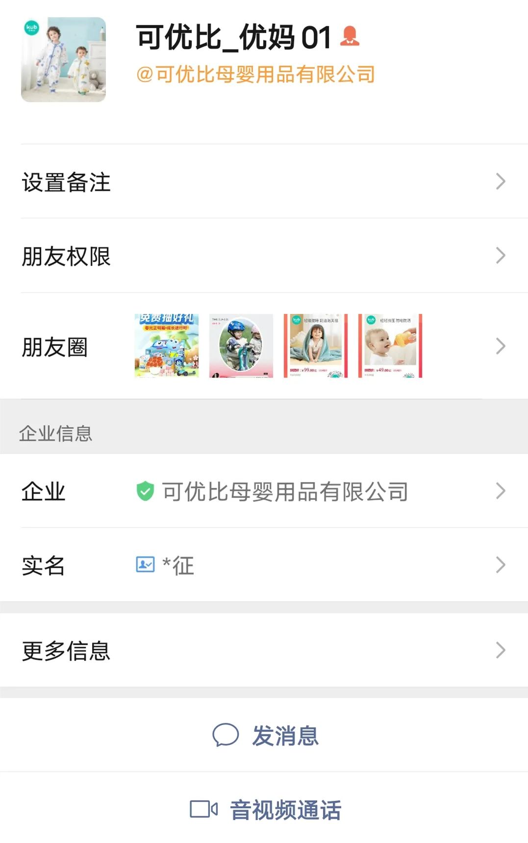 账号信息介绍页同可优比优妈一样,只能看到是企业微信,但是企业微信信息页上的一些关联入口没有利用起来;而朋友圈甚至都没有开放,而且头像也是普通的卡通头像,与可优比的品牌形象并没有关联。