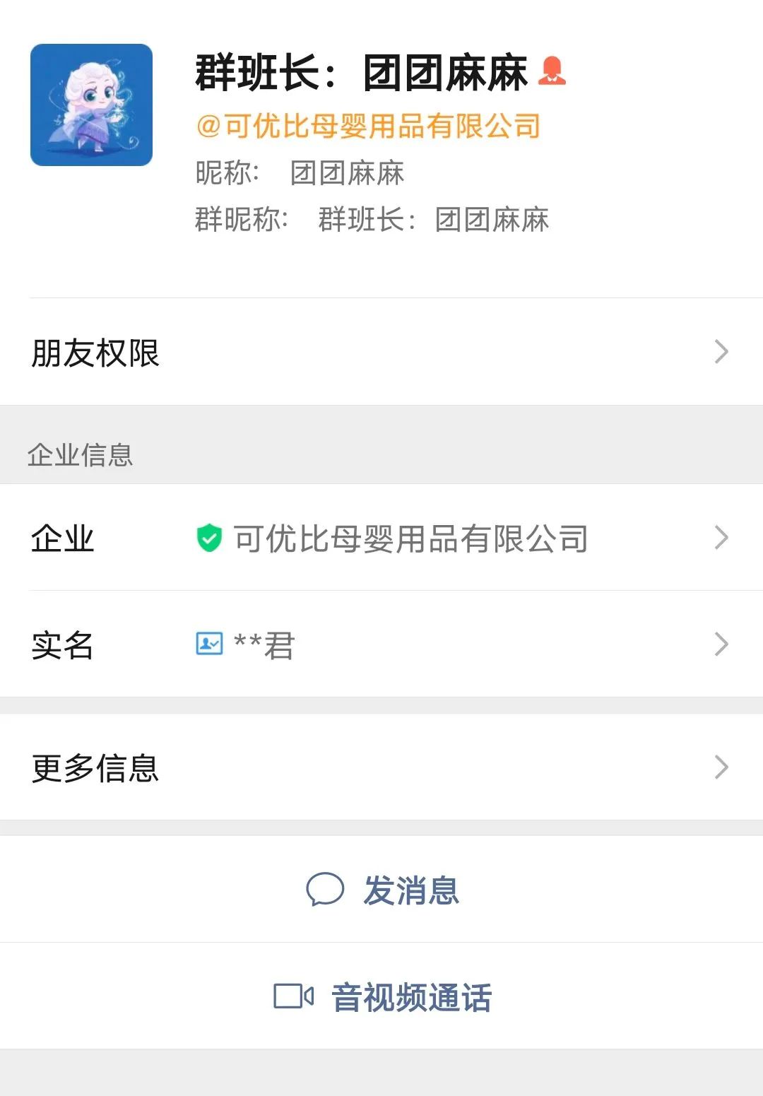 可优比私域社群内的主要KOC是群班长,也同样是可优比企业微信的账号,我所在的社群内的群班长是团团麻麻。