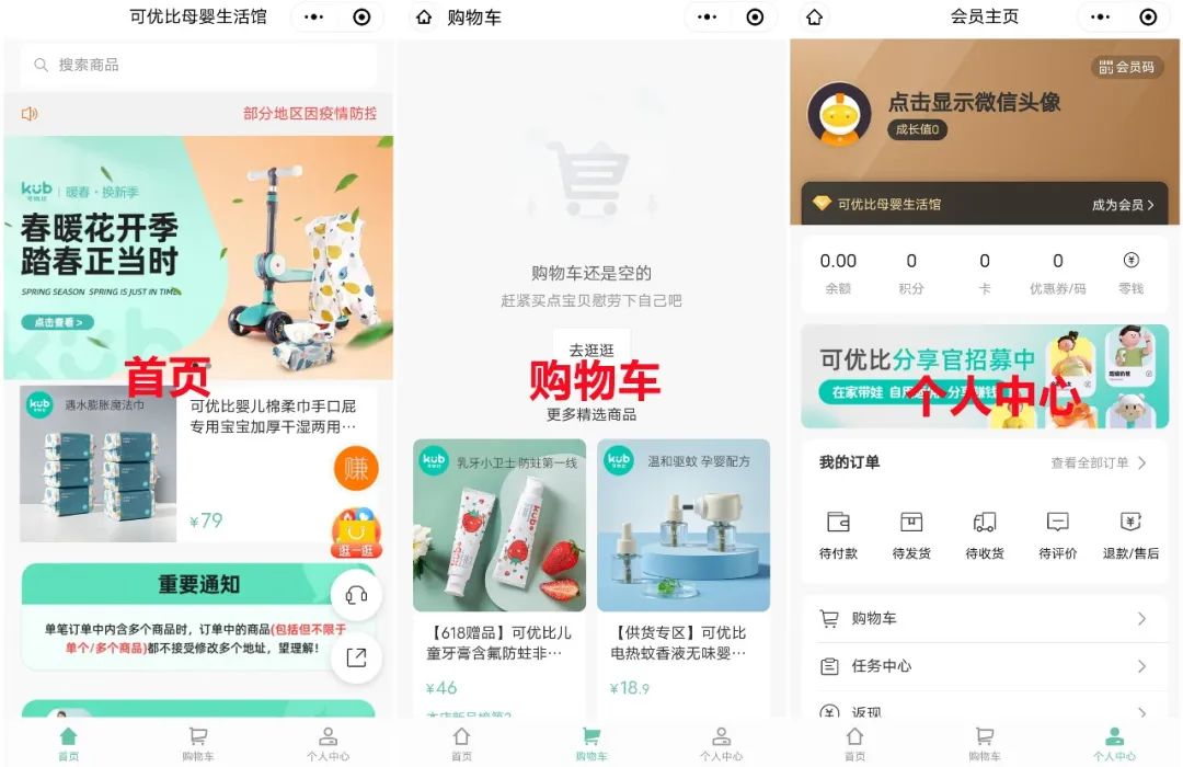 可优比的官方小程序是 【可优比母婴生活馆】,整个小程序是在有赞的产品基础上搭建起来的。