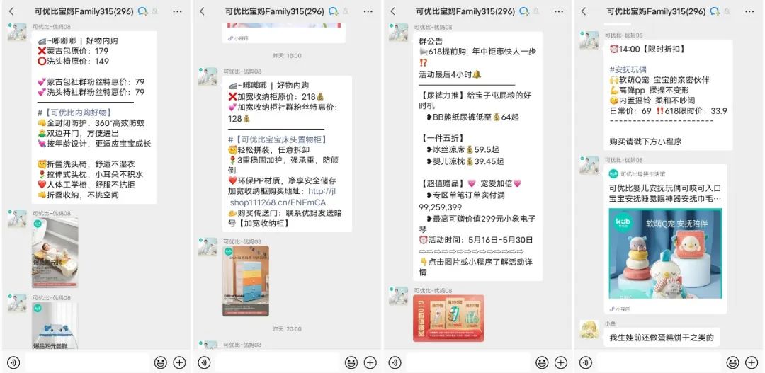 可优比优妈会在社群内定时推送商品优惠相关的营销信息,主要包括: