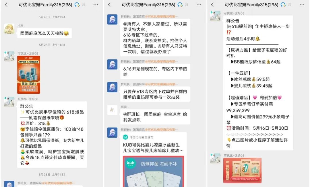 其中可优比宝妈承担的是官方客服和销售的角色,负责推送官方的营销活动消息;