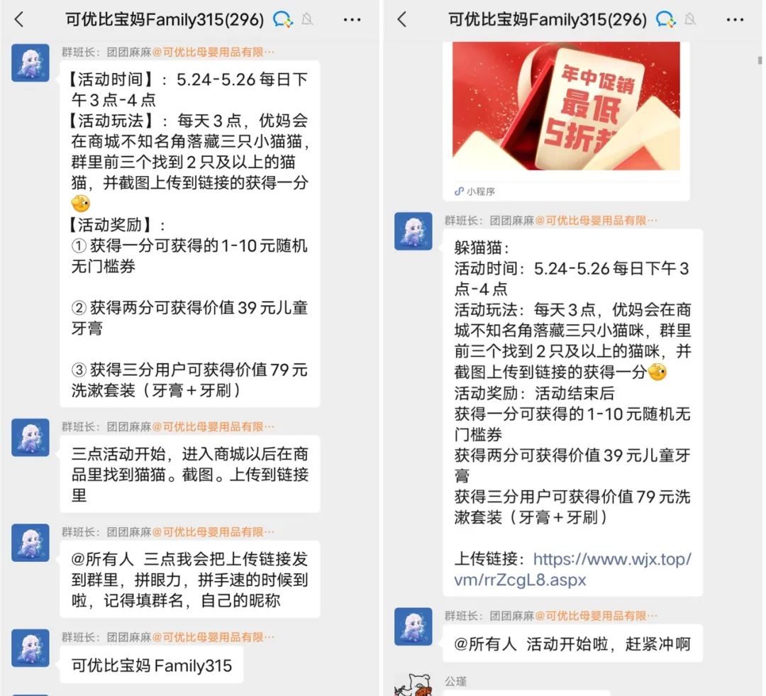 可优比还会在社群内举办商城躲猫猫活动,引导用户进入商城找猫猫,参与活动领取奖品;