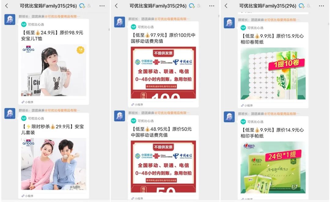 团团妈妈作为社群内的KOC,经常会在社群内分享商品和优惠活动,方式也比较简单直接,都是直接把商品的小程序发在群内,频次较高而且时间不固定,大多数时候都是直接发商品,不配文案;