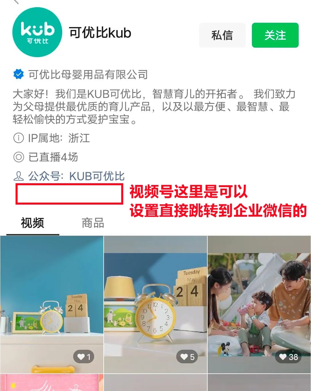 另外,可优比的公众号关联的可优比视频号的简介处,也没有放置所关联的企业微信的入口,也少了一个用户添加企微的渠道。